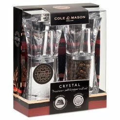 These contemporary- look salt and pepper mills will add style to any table, whilst remaining a functional everyday kitchen tool. The Crystal Mills Gift Set offers simplicity and refinement style matched with transparent acrylic so you can view the contents knowing, which is which, plus, knowing when it is time to fill up. The Cole & Mason Precision Mechanism does not crush peppercorns but strips them to release maximum flavour with each turn. The salt mill features the diamond sharp ceramic mechanism cutting through the hardest of salt and peppers, allowing for a smooth and even turn. You can easily adjust the grind from fine to course with ease. For peace of mind the Crystal Mill mechanisms come with a lifetime guarantee and beautifully packaged ready for gifting.