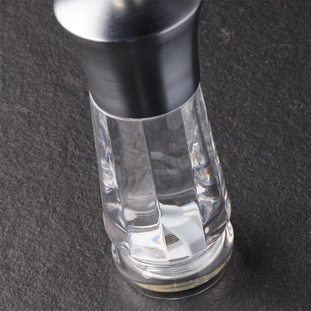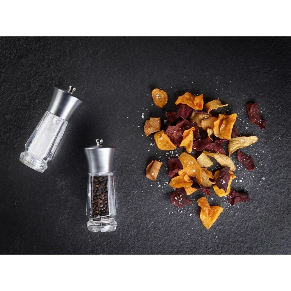 The Exford Mills have a multi-faceted clear acrylic body with a satin finish ‘Nickel’ stainless steel top. The Exford Pepper Mill features the all-new Precision+ mechanism. The new mechanism improves upon the current, award-winning Precision mechanism. They are designed for ultimate efficiency and optimal output; 40% more ground pepper can be released with the same number of turns. Research done by Nottingham University proves that the new mechanism delivers more flavour from the peppercorn. The salt mill still features the diamond sharp ceramic mechanism cutting through the hardest of salts, allowing for a smooth and even turn. Built with a spring-loaded mechanism you can adjust the grind from fine to course with ease; tighten the knob on the top for a finer grind. For peace of mind the Exford Mills come with a lifetime guarantee.