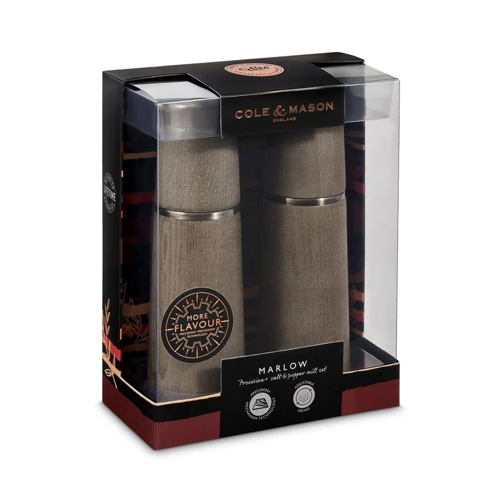 The Cole & Mason Marlow salt & pepper mill set is the perfect balance of stylish sophistication and superior performance. Made from grey-stained beech, the natural beauty to the wood is finished with a gunmetal accent. The Marlow Pepper Mill features the all-new Precision+ mechanism. The new mechanism improves upon the current, award-winning Precision mechanism. They are designed for ultimate efficiency and optimal output; 40% more ground pepper can be released with the same number of turns. Research done by Nottingham University proves that the new mechanism delivers more flavour from the peppercorn. The salt mill still features the diamond sharp ceramic mechanism cutting through the hardest of salts, allowing for a smooth and even turn. You can easily adjust the grind from fine to course with ease; tighten the knob on the top for a finer grind. For peace of mind the Marlow Mill mechanisms come with a lifetime guarantee.