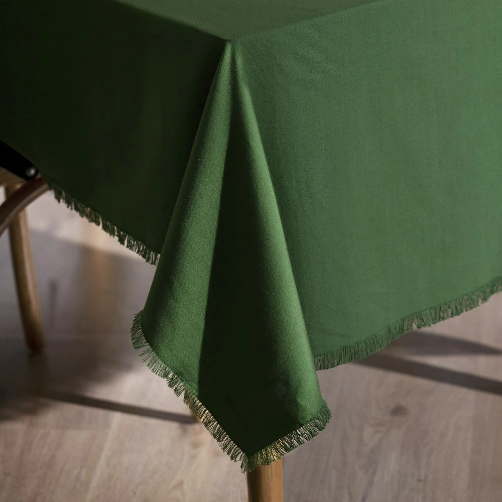 Create an ambient dining environment with the beautiful Ecology Fray Tablecloth Dill atop your dining table. A fantastic accessory to enhance your entertaining abilities, the Ecology Fray Tablecloth Dill is sure to impress guests whether itβs used to create a casual atmosphere or fashion a more sophisticated soiree. Constructed from premium 100% cotton, each piece boasts an appealing rustic surface and superior durability. With its lush forest green colourway, the tablecloth makes a bold statement and is easy to style with both intense colours and understated, neutral shades. Surrounded with frayed edges, this tablecloth complements summertime alfresco dining settings thanks to its chic boho aura. Pop the Ecology Fray Tablecloth Dill in the washing machine for fuss-free cleaning and be sure to match it with other stunning napery and colours from the Fray range.