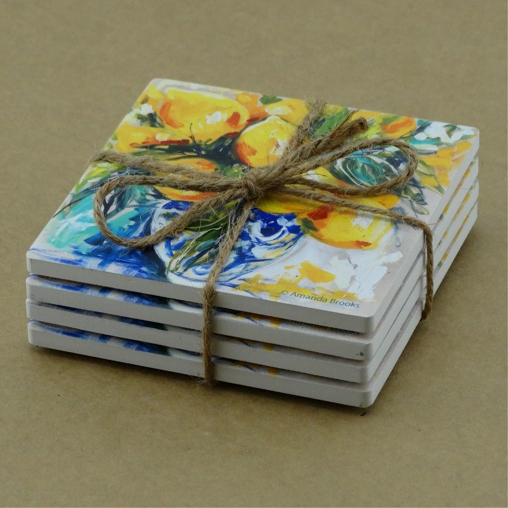 There’s no need for wall art when the Lilli Rock Aimee Lemon Set of 4 Coasters adorns the tabletop. Graced with breathtaking artwork by Australian artist Amanda Brooks, the Lilli Rock Aimee Lemon Set of 4 Coasters features a regal vase overflowing with a bouquet of succulent lemons in a wonderfully fresh colour palette. Crafted from natural dolomite stone, the coasters do a highly effective job of absorbing liquid condensation build-up on cold glasses, while their cork backing prevents scratches to the surface below. Easy to maintain, the coasters can be simply wiped with a damp cloth when required. Elegantly presented, tied together with eco-friendly jute twine, the Lilli Rock Aimee Lemon Set of 4 Coasters makes a fantastic stylish and functional addition to any breakfast bar, dining or coffee table.