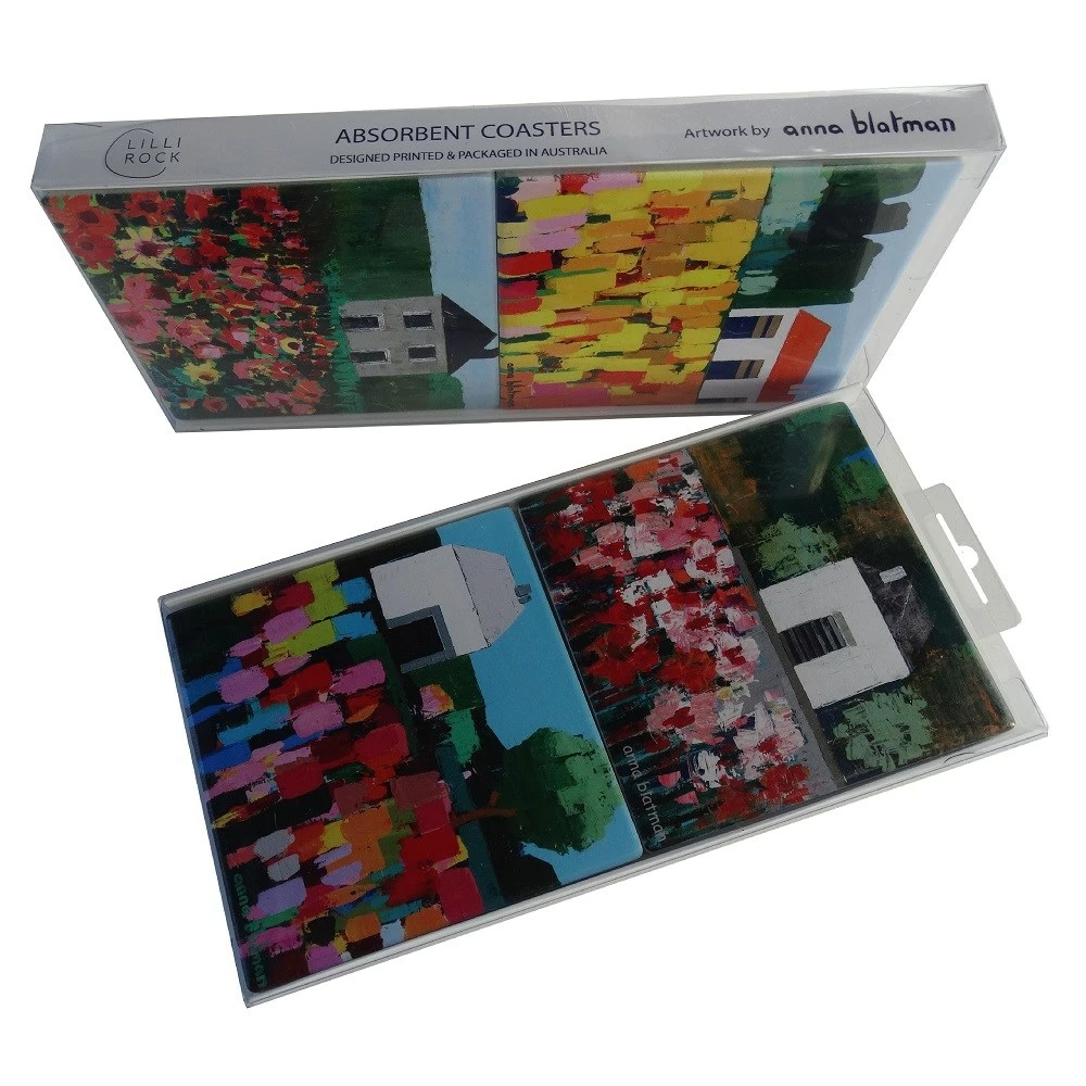 Add an elegant touch to your dining area with the Lilli Rock Anna’s Houses Set of 4 Coasters. Crafted from incredibly durable and absorbent dolomite stone, the Lilli Rock Anna’s Houses Set of 4 Coasters does a fantastic job of absorbing the condensation build-up from cold drinkware. Paired with soft cork backing, the coasters effectively protect your surfaces from scratches, stains, water and heat damage. Designed and printed in Australia, the coasters feature beautiful artwork by artist Anna Blatman. A variation of four different scenes of tranquil cottages nestled in fields of vibrant flowers are guaranteed to brighten the tabletop. Stylishly boxed for effortless gifting potential, the Lilli Rock Anna’s Houses Set of 4 Coasters can be paired with complementing trivets from Lilli Rock for an impressive table setting.