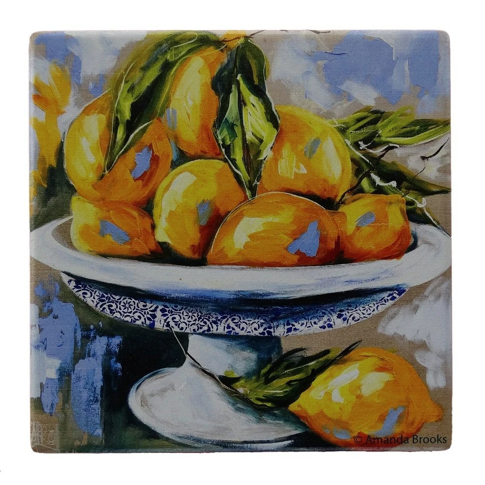 Refresh and revive your dining area with the vibrant Lilli Rock Seasonal Fruit Set of 4 Coasters. Adorned with beautiful artwork by Australian artist Amanda Brooks, the coasters feature four varied designs of intricate still-life fruit bowls including apples, oranges, pears and lemons. Crafted from natural dolomite stone, the Lilli Rock Seasonal Fruit Set of 4 Coasters does a highly effective job of absorbing liquid condensation build-up on cold glasses, while the cork backing prevents scratches to the surface below. Beautifully boxed and presented, the Lilli Rock Seasonal Fruit Set of 4 Coasters makes a fantastic stylish and functional addition to any breakfast bar, dining or coffee table. Easy to keep clean, simply wipe the coasters down with a damp cloth when required.